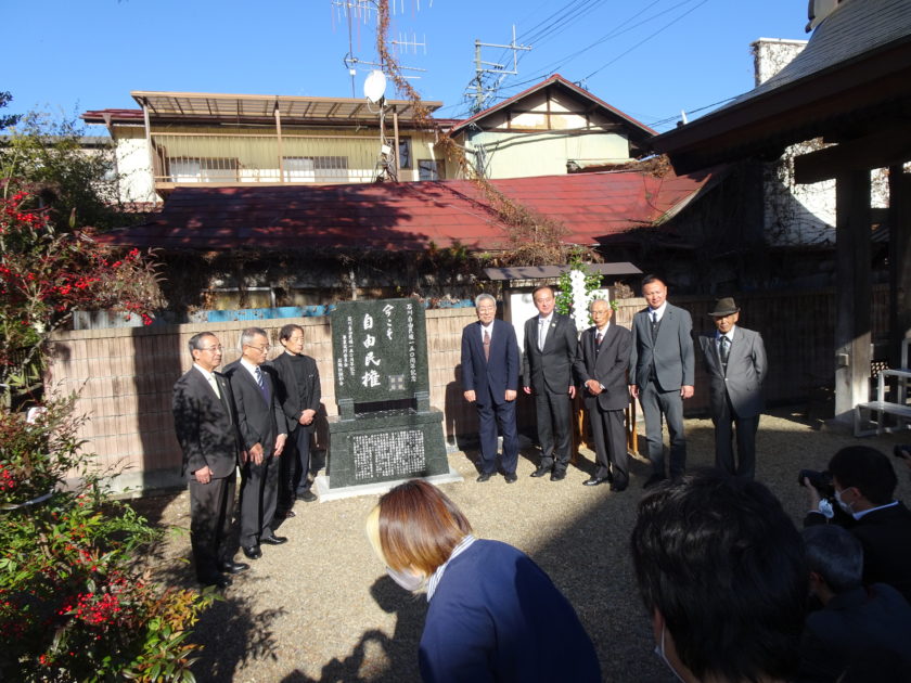 令和7年11月30日、石川町鈴木重謙屋敷内に石川自由民権150周年記念碑が設置された。事業を行ったのは、石川自由民権150周年記念事業実行委員会(代表 古藤邦英)だ。記念碑は、250件を超す団体個人の寄付などで建立された。当日は、記念碑の除幕式、記念事業式典、記念講演(講演講師:早稲田大学名誉教授 安在邦夫)が行なわれ、自由民権運動顕彰の大きな節目となった。50年後の200周年には、どんな風景が見られるのだろうか。